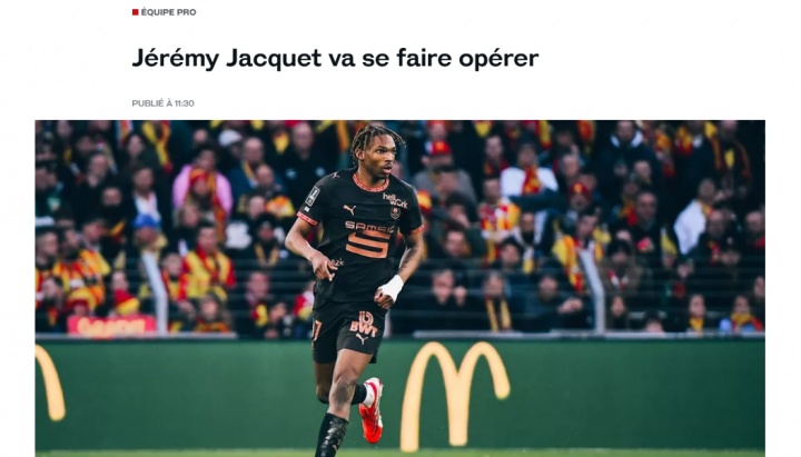 03月03日讯 据雷恩官方消息,中后卫雅凯将在未来几天接受手术,法媒《队报》预计球员将赛季报销。