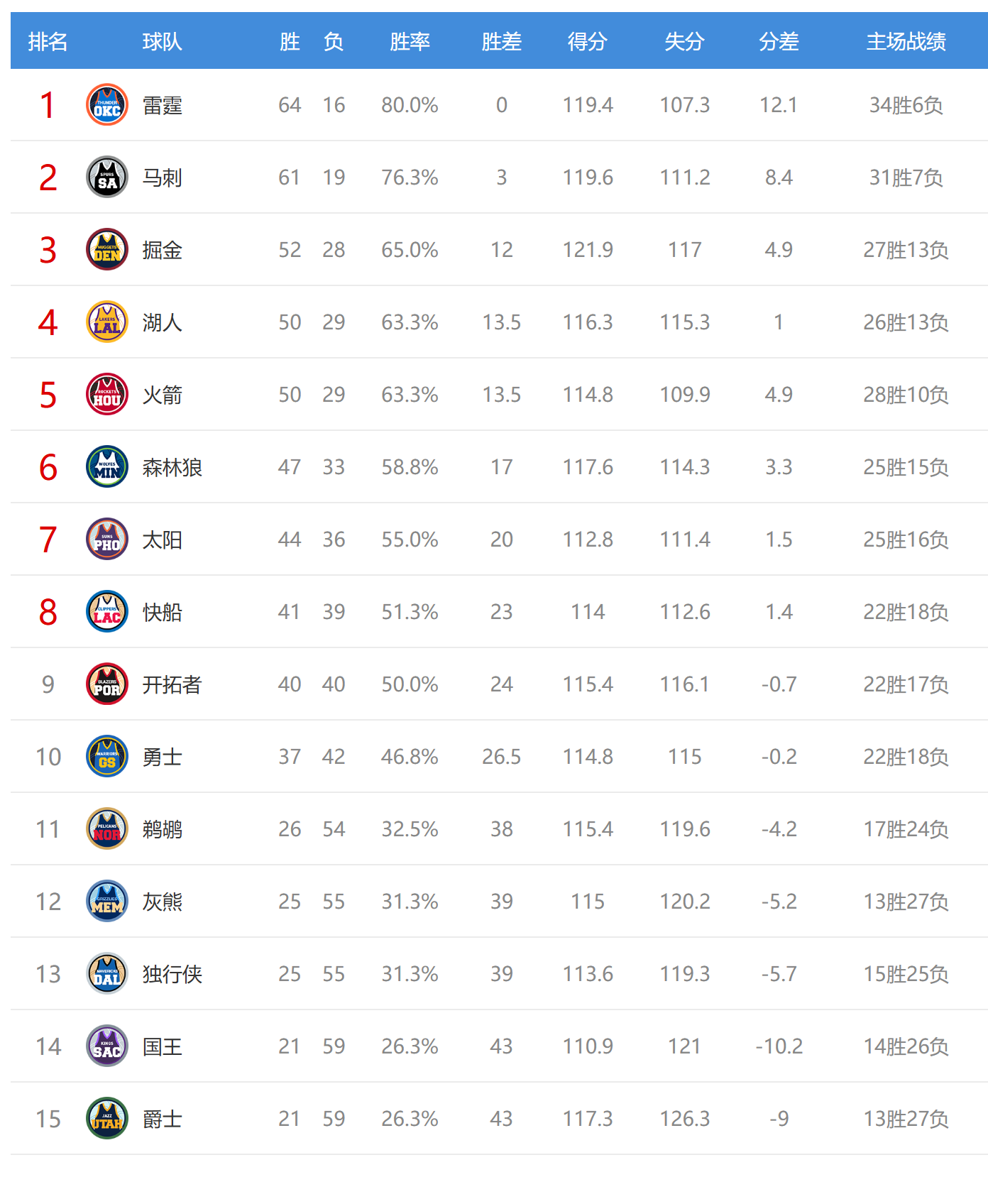 北京时间2026年4月9日,今日NBA有7场比赛,马刺、掘金、雷霆、森林狼、快船、太阳、开拓者、独行侠、灰熊参与其中,赛后西部排名有什么变化呢?